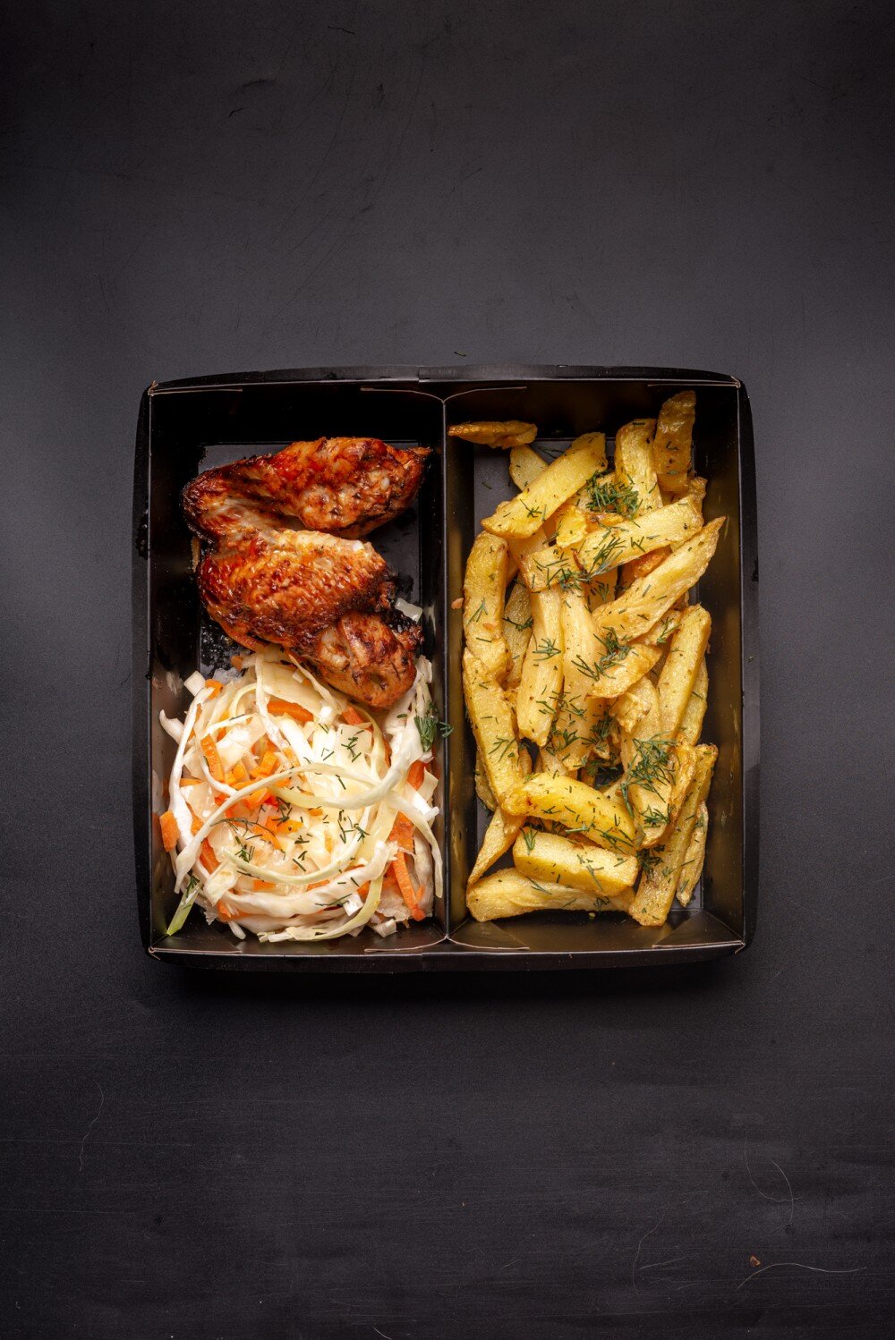 Картофельные дольки - 200гр. Куриные крылышки - 150гр. салат "Капустный" - 150гр.